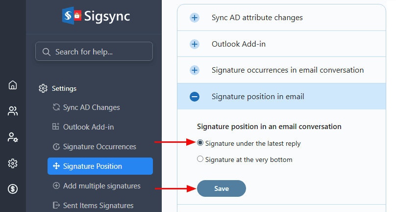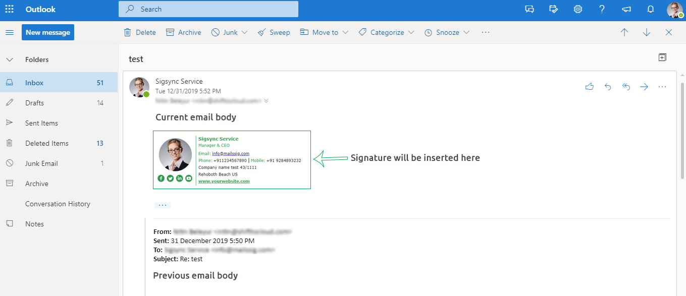 Email conversations for forward and reply mails can become very lengthy for back and forth communications. When a signature is placed at the end of the email conversation, it becomes barely visible and goes out of sight for long conversation chains. For important correspondence essential information might therefore be lost. To avoid such a situation, Sigsync can append an email signature right under the latest reply or forward mail so that the email signature always appears at the top of the email chain