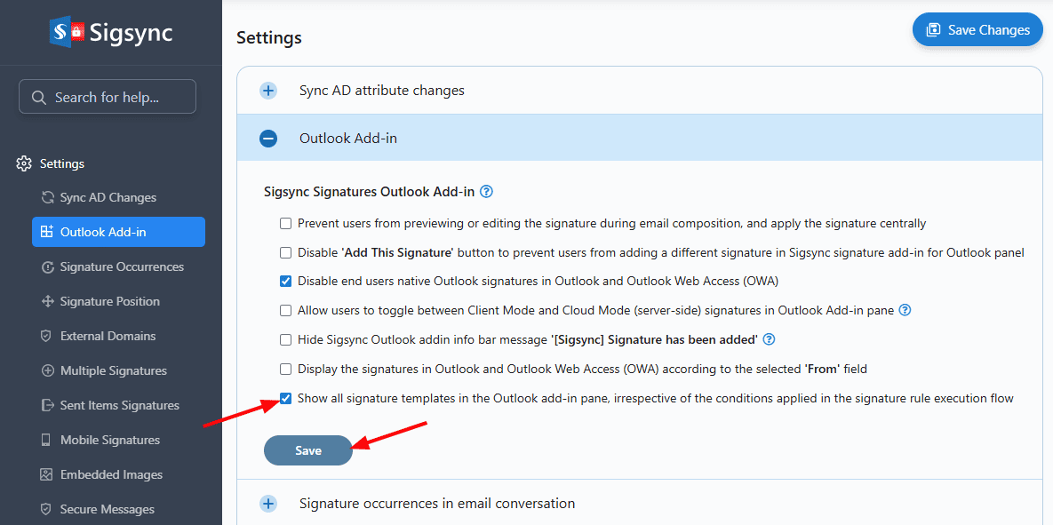 Sigsync Office 365 Email Signature Software provides centralized management and control of email signatures across the organization. In the Sigsync settings, administrators can enable the option ‘Show all signature templates in the Outlook add-in pane, irrespective of the conditions applied in the signature rule execution flow.’