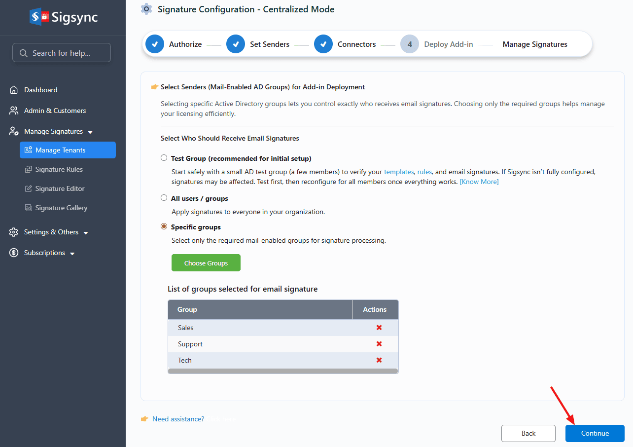 - Add-in Deployment: Set the Senders for the Add-in Deployment, then click ‘Continue’ to proceed.