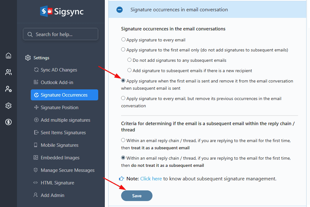 There are two additional options under signature rules to customize adding different signatures to subsequent emails or use the same signature for all the emails. Know more...