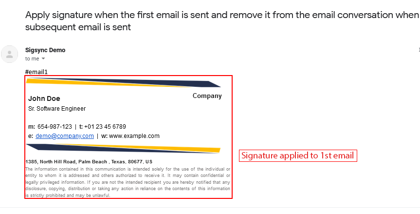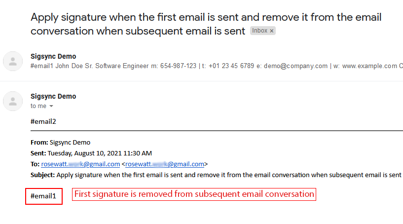 As illustrated in the screenshot below, the email signature is added to the very first email (#email1) from the sender. In the subsequent email (#email2) from the same sender, the email signature added under the first conversation is removed.