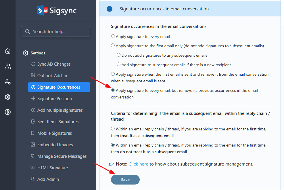 There are two additional options under signature rules to customize adding different signatures to subsequent emails or use the same signature for all the emails. Know more...