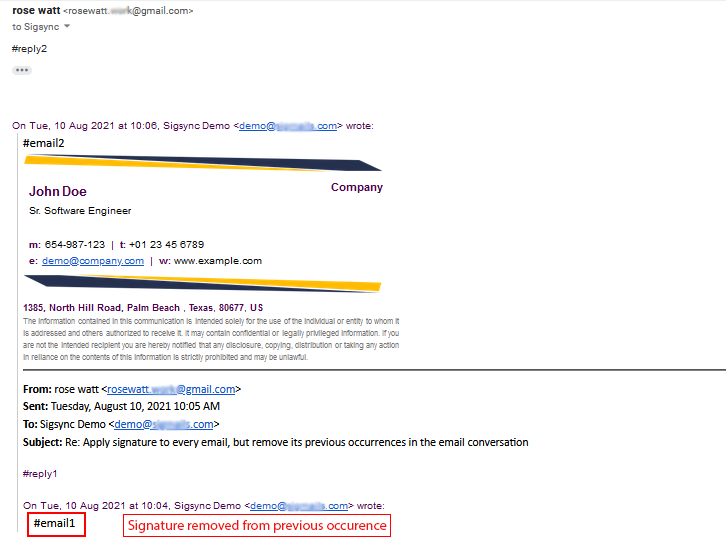 As shown in the screenshot below, the email signature is appended for the very first email (#email1) sent by the sender. For the subsequent email (#email2) from the same sender, the signature under the first email (#email 1 which is a previous occurrence) is removed and a new signature is added under the second email (#email2)