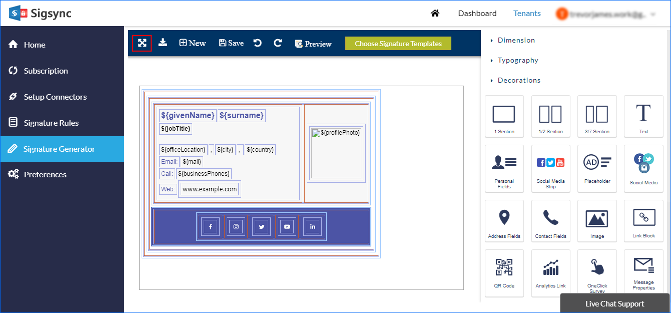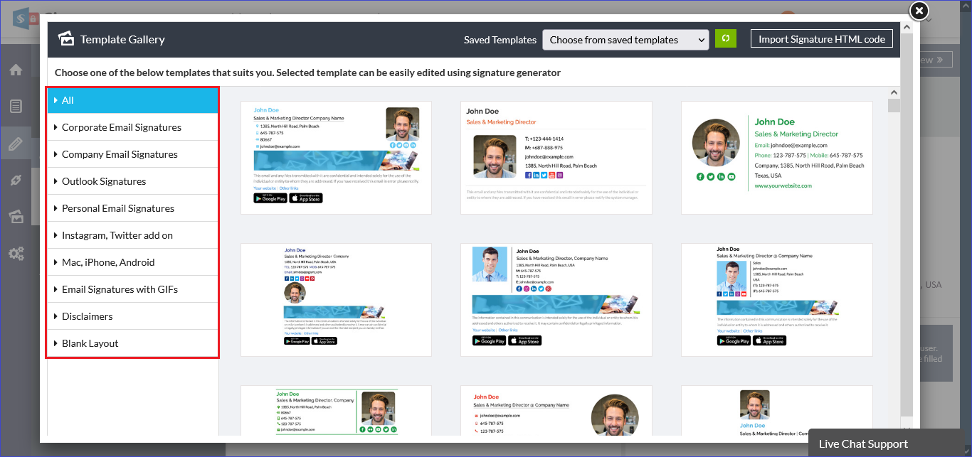 Choose Signature Templates - Sigsync provides wide variety range of templates for Sigsync users. You can pick a layout that suits your needs from wide range of templates provided in different categories or select 'Blank Layout' to start from scratch. You can also pick from Saved templates list and modify existing saved templates if you have saved templates previously.