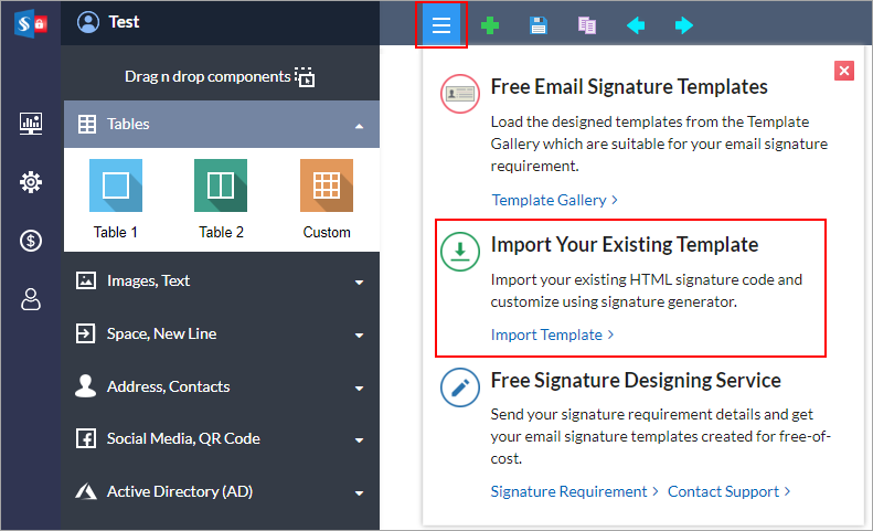 ( ) Import html code - This '' button lets you use html code if you already had existing html signature created and ready to use. You can customise your signature after importing html code. Click the button as shown below and then ‘Ctrl+v’ or right click on text to paste the code. Click 'Import' button.