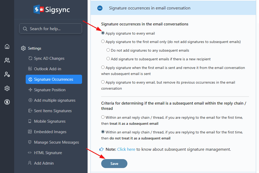 By default, Sigsync applies a signature to every email when the signature meets the conditions set up under Signature Rules. The above additional options let you choose the signature occurrences in conversations and are useful if you want to customize and change the default method of adding signatures to emails.