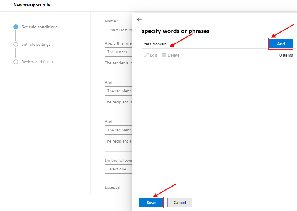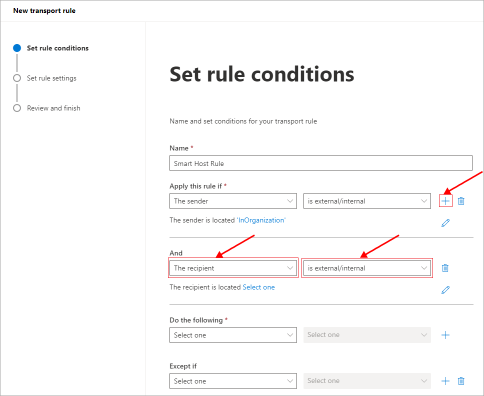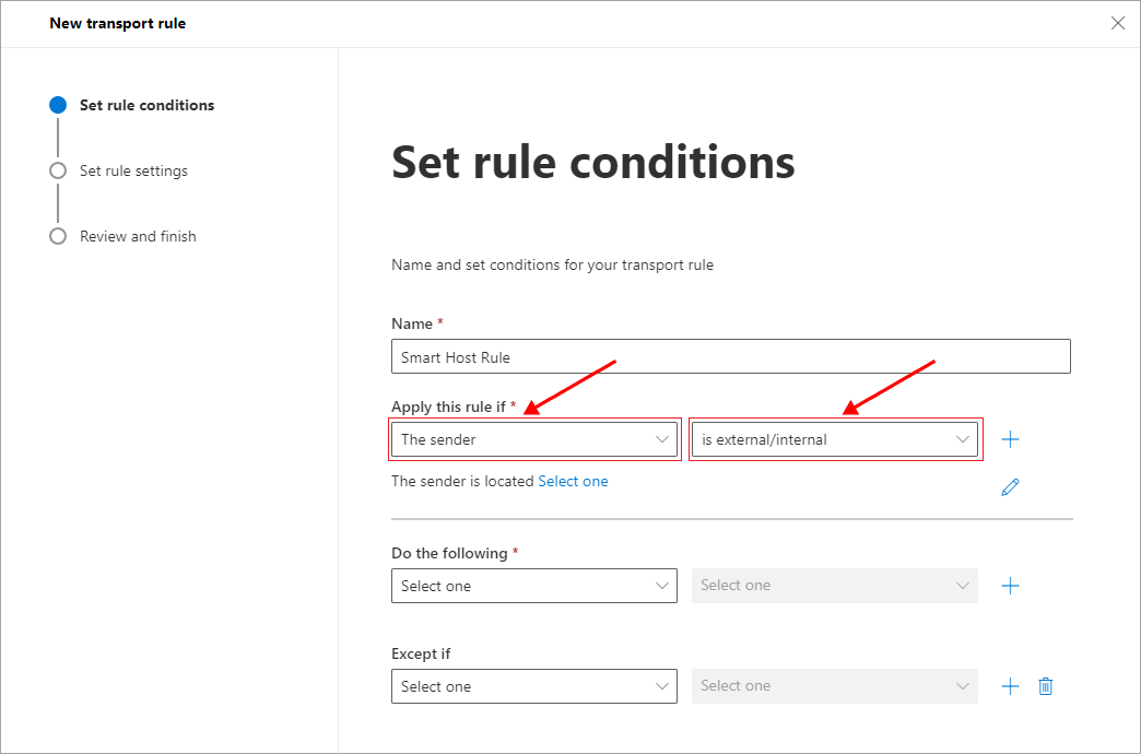 Step 3: Create or edit a transport rule for a smart host and set the conditions for senders and recipients