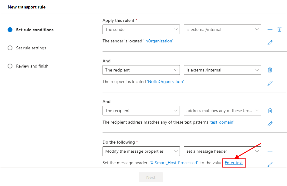 For Example, message header text can be 'X-Smart_Host-Processed'. - Step 4: Click the ‘Enter text’ link to set message header value