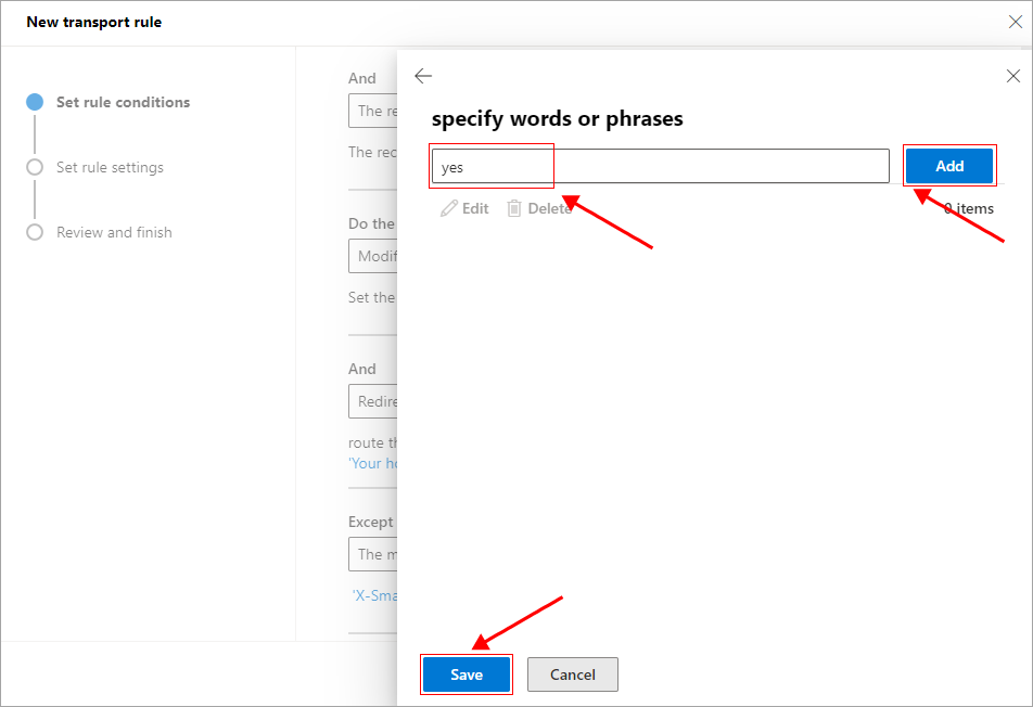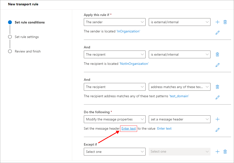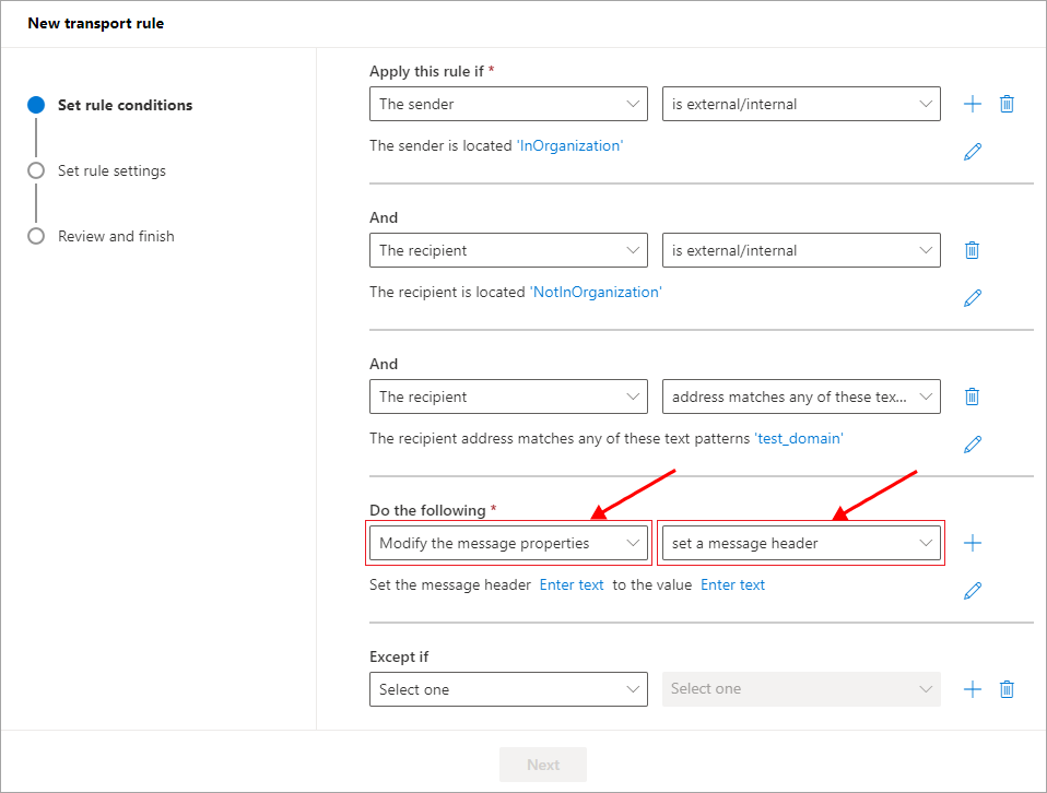 - Step 1: Under the ‘Except if’ section add a new exception by selecting ‘The message headers…’ and ‘includes any of these words’.