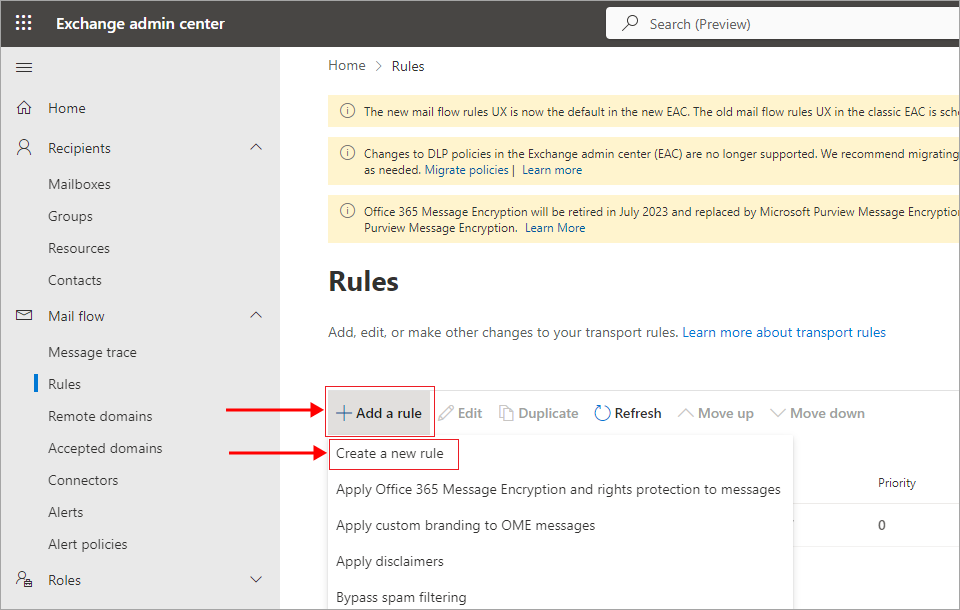 - Step 3: Navigate to the ‘Mail flow’ > ‘Rules’ tabs
