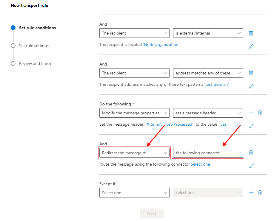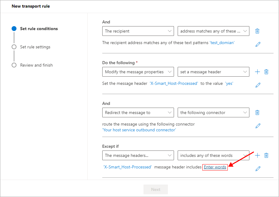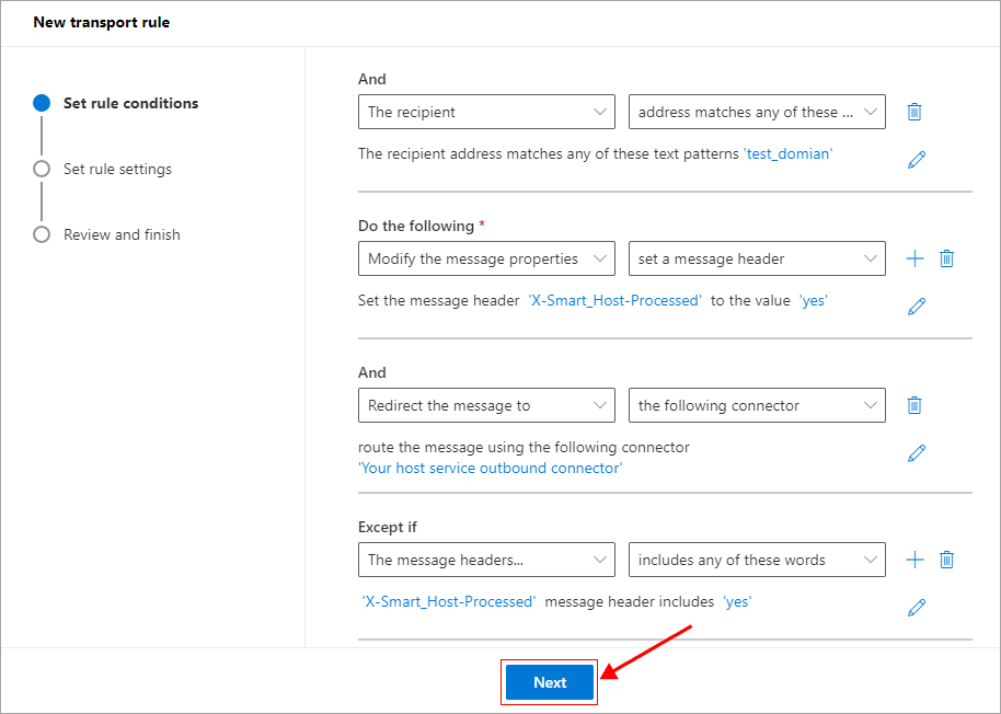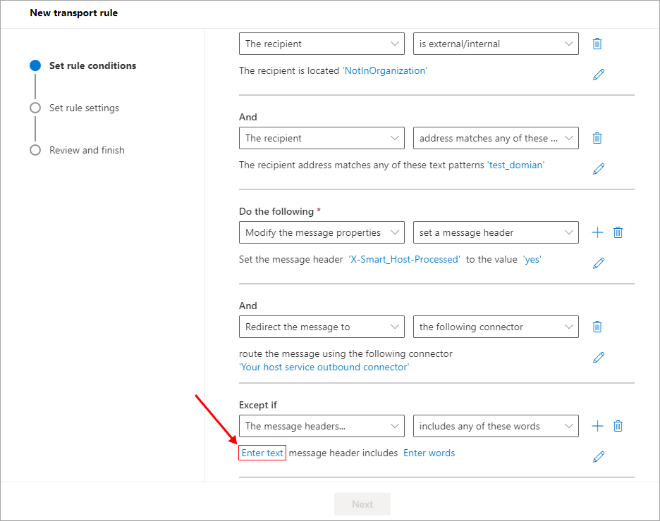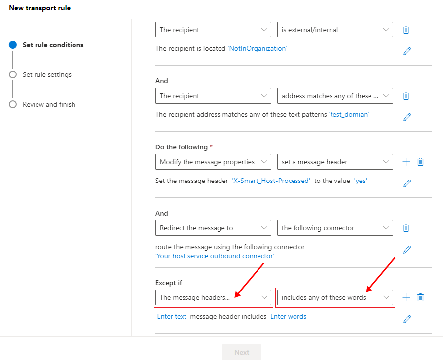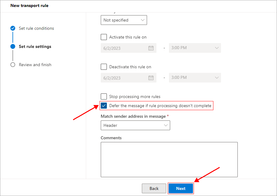 - Step 2: Enable the option ‘Defer the message if rule processing doesn't complete’. After this option is enabled, your message will persistently attempt to utilize the smart host, even if the previous attempt was unsuccessful. Click the ‘Next’ button to proceed to the ‘Review and finish’ step.