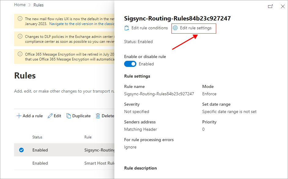 Once the signature is added, the email is routed back from the Sigsync Azure email service to Exchange Online Protection. At this stage, the Sigsync transport rule is not executed again, rendering the 'Stop processing more rules' option invalid. Consequently, any other rules configured for your tenant will now be executed.- Step 1: Click the ‘Sigsync Routing Rules’.