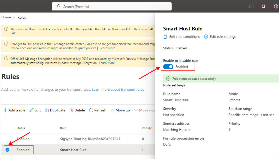 - Once you have created the rule, it will be placed at the bottom of the rules list with the lowest priority. By default, the rule will be disabled. To ensure the desired placement, select the new rule and click the ‘Move up’ button to position below the Sigsync Exchange transport rule.By default, Sigsync Rule has a priority of ‘0’. To maintain the desired order, assign a priority of ‘1’ to your smart host rule shown in the screenshot below. You can also manually adjust the rule's priority if needed. Lastly, Select the smart host rule and activate it by toggling the switch to the ‘Enabled’ position.
