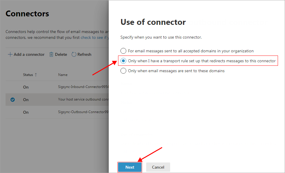 - Step 7: Select the option ‘Only when I have a transport rule set up that redirects messages to this connector’.