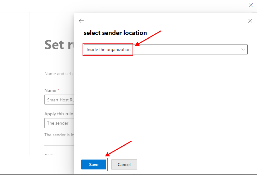 - Step 7: Select ‘Inside the organization’ and click the ‘Save’ button . This will ensure that all emails sent from your Office 365 tenant are routed through the connector.
