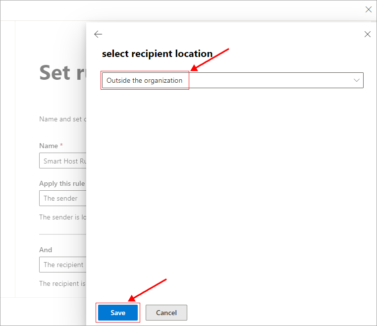 - Step 9: Select ‘Outside the organization’ and click the ‘Save’ button . This ensures internal email sent from your Office 365 tenant will be routed through the connector by avoiding mail loops.