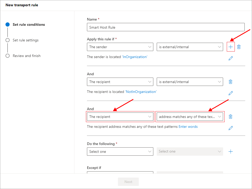 - Step 8: Click the ‘+’ icon to add another condition and select ‘The recipient’ and ‘is external / internal’.