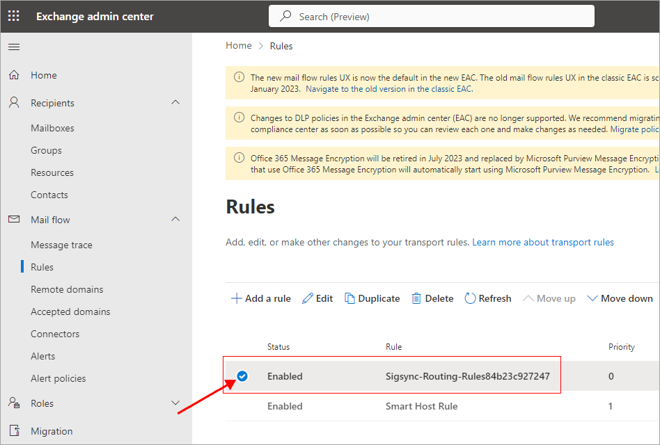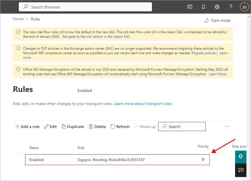 Step 1: Ensure Sigsync Azure service Exchange transport rule priority is set to top