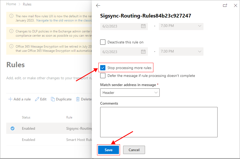 - Step 3: Check ‘Stop processing more rules’ and click the ‘Save’ button to save the rule changes. This guarantees that Sigsync processes all the emails and adds Signature to it and then the Security service processes the email to make it secure.