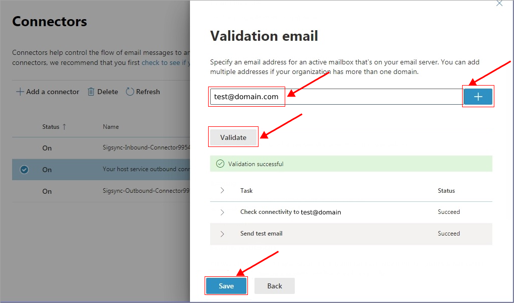 - Step 8: You will be prompted for the validation email. Once it is successful, click the ‘Save’ button to save changes to the connector.