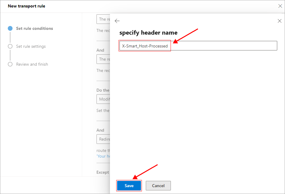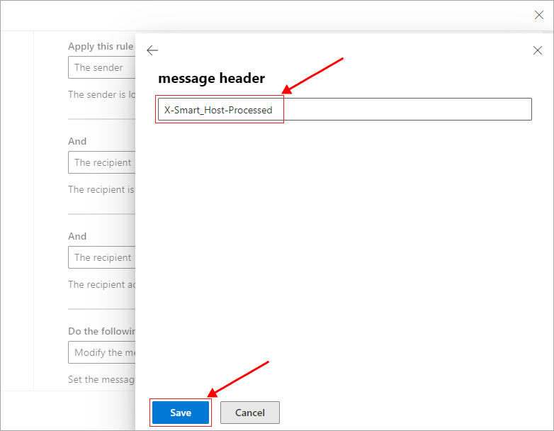 - Step 3: Enter the same name (For Example, message header text is 'X-Smart_Host-Processed') for the message header as you have used in the previous step and click the ‘Save’ button