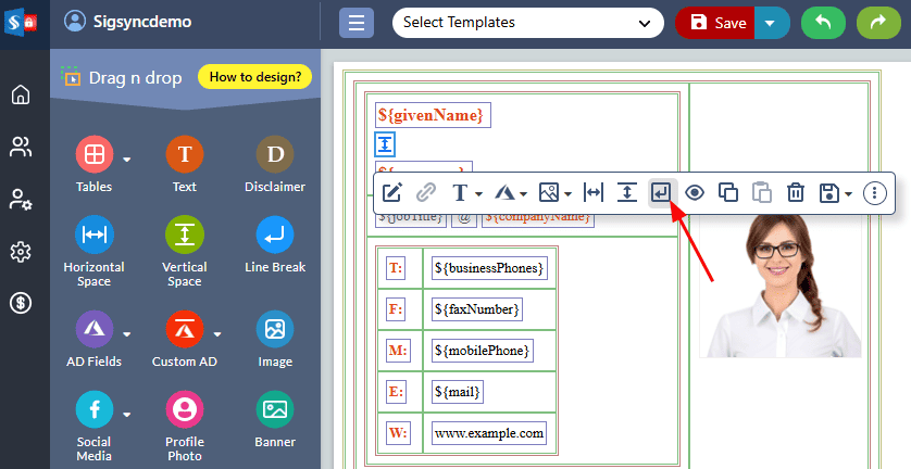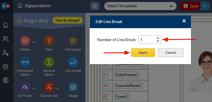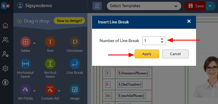 To set the properties for the ‘Line Break’ component in Sigsync Editor, select the Line Break component from the design pane and set the number of line breaks you want to give.