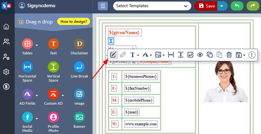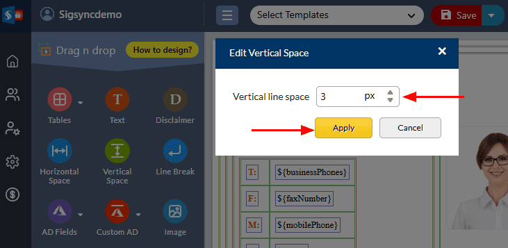 The 'Edit Vertical Space' property in Sigsync editor enables you to modify the amount of horizontal space between any two fields within your email signature