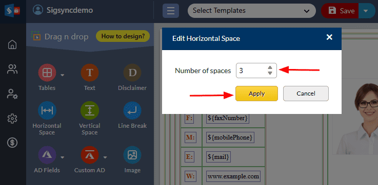 The 'Edit Horizontal Space' property in Sigsync editor enables you to modify the amount of horizontal space between any two fields within your email signature