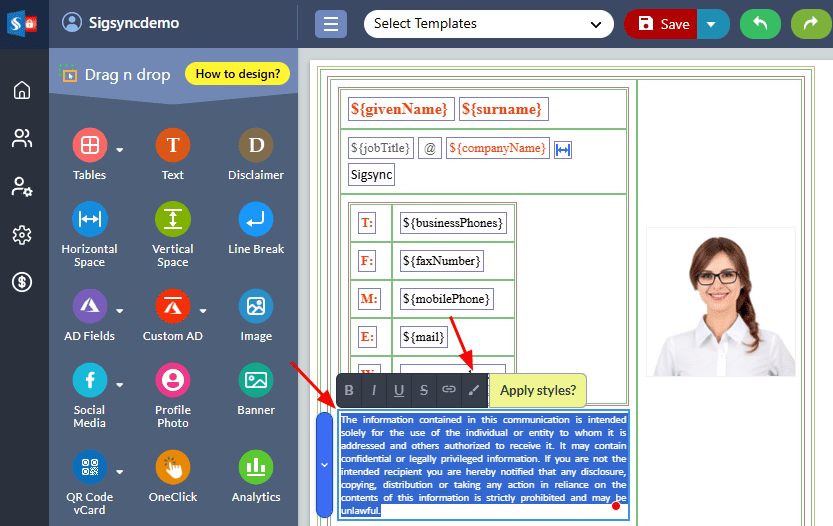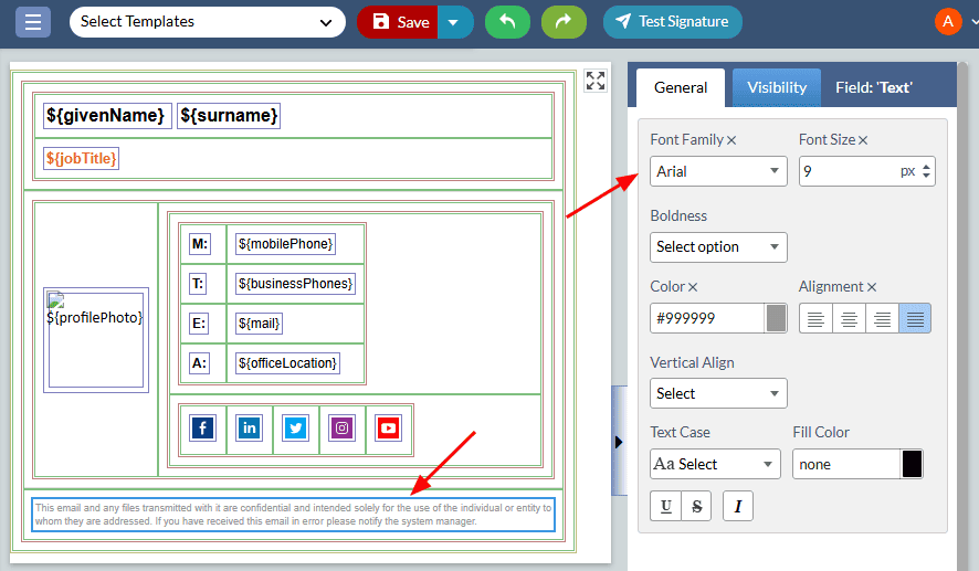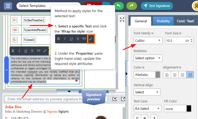 - To set the style, just select the disclaimer text and click the 'Wrap for style' icon, and set the required style properties on the right side of the signature editor