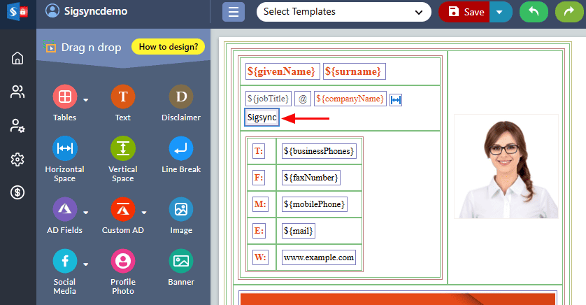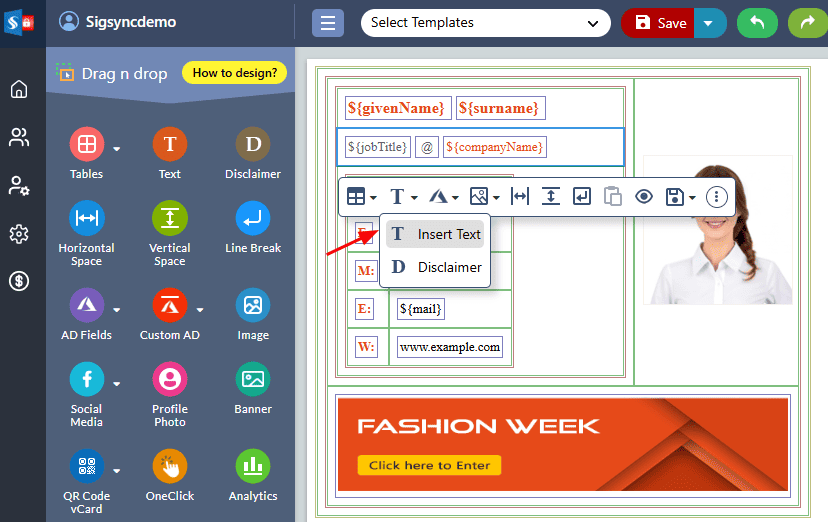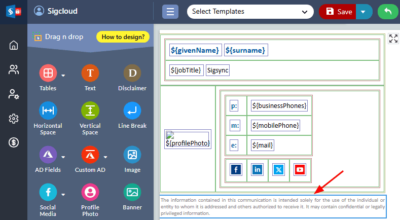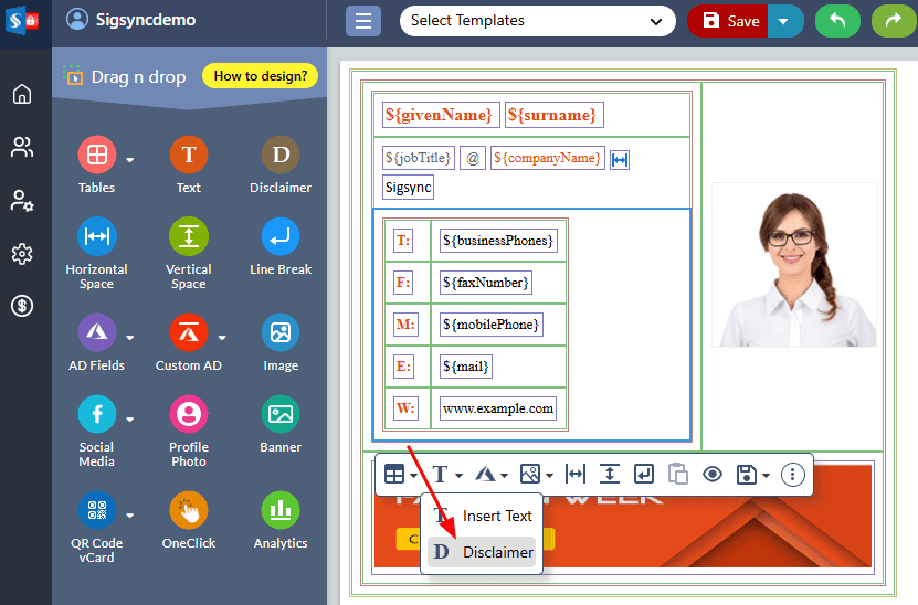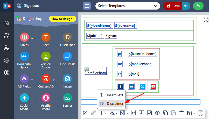 The ‘Text and Disclaimer’ components in the Sigsync editor enable the inclusion of custom text or disclaimers in email signatures. This feature is especially beneficial for organizations that must include legal or regulatory disclaimers in their email signatures. The component offers customization options and helps manage disclaimers efficiently, ensuring their consistent inclusion in all outgoing emails.