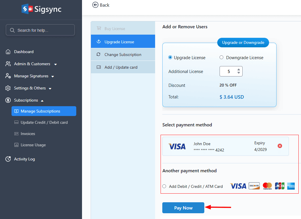 - You can keep the previous payment method or select another payment method. Let’s keep the previous payment method and click the ‘Pay Now’ button.The new licenses will be effective immediately in the current billing cycle