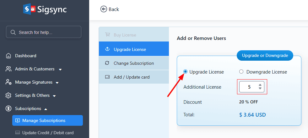 - Now, under the Update License tab, select the ‘Upgrade License’ option. Enter the number of licenses to be upgraded or use ‘Up arrow (▲)’ or ‘Down Arrow (▼)’ to increase or decrease the values.