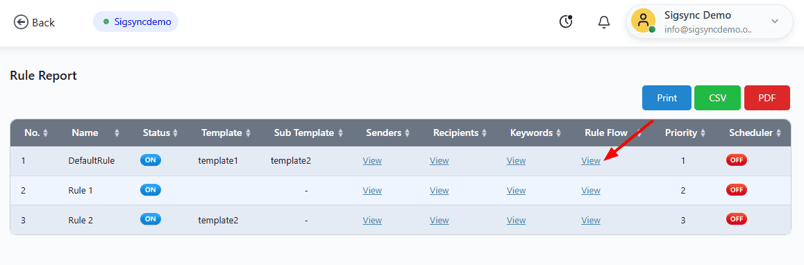 Sigsync Signature Rules ‘View Report’ provides comprehensive insights into the signature rules that will be applied to include or exclude signatures . This report allows you to view various details such as rule name, status, template name, subsequent template, senders, recipients, keywords, rule execution flow, priority, scheduler, and more.
