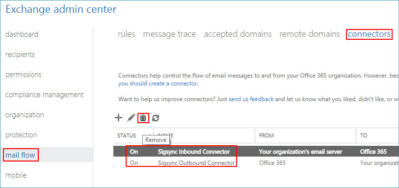 Now, click on 'Connectors' tab and select 'Sigsync Outbound Connector', click delete button as shown below. Select 'Sigsync Inbound Connector', click delete button again.