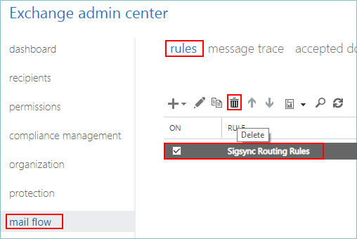 Select 'mail flow' in the navigation menu on left side of screen and select 'Rules' tab and then select the 'Sigsync Routing Rules', click delete button as shown below.