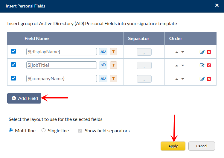 You can use individual as well as group of Active Directory Fields (Personal, Address, Contacts)in your signature.