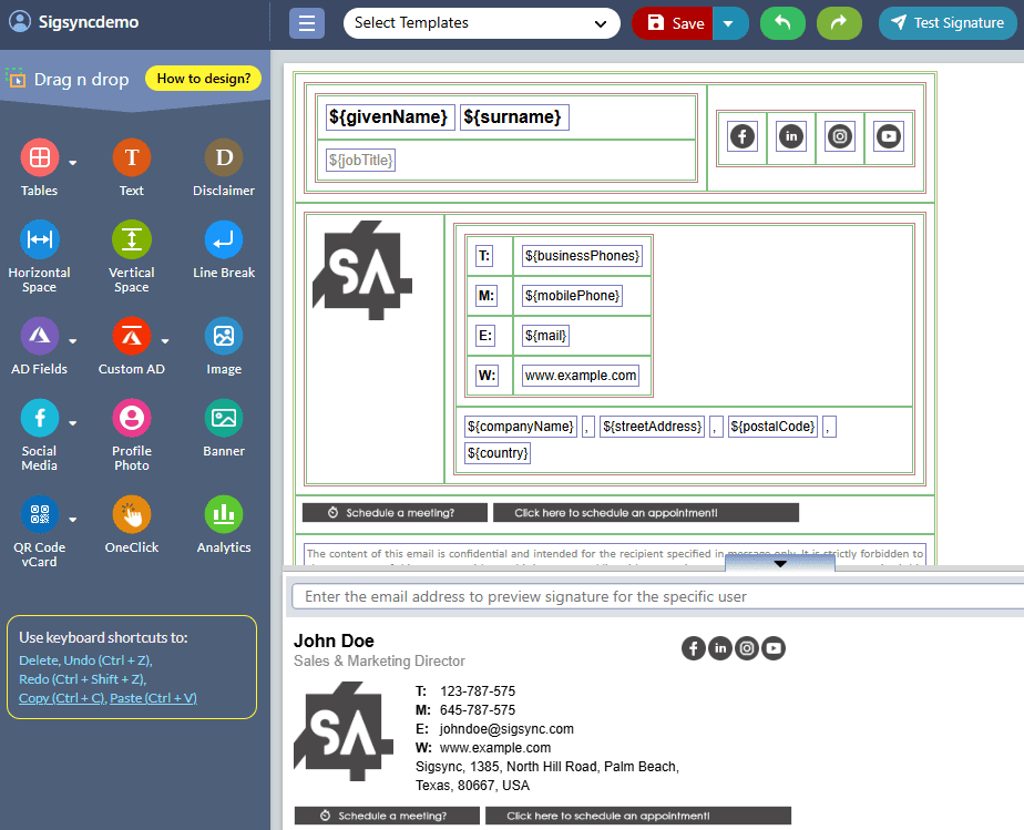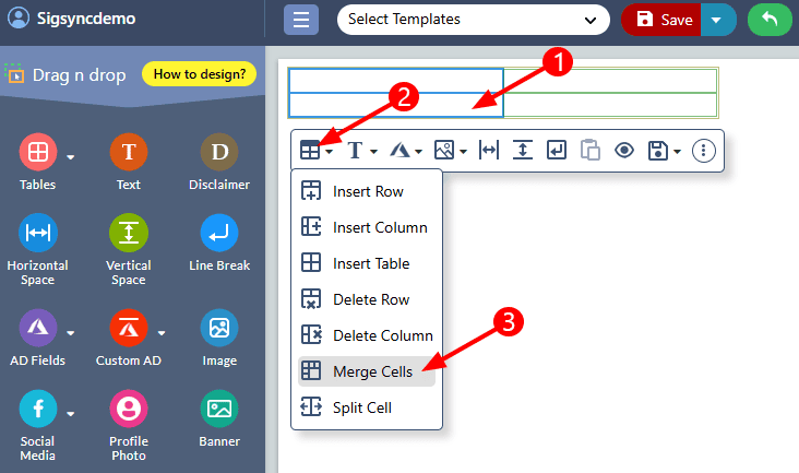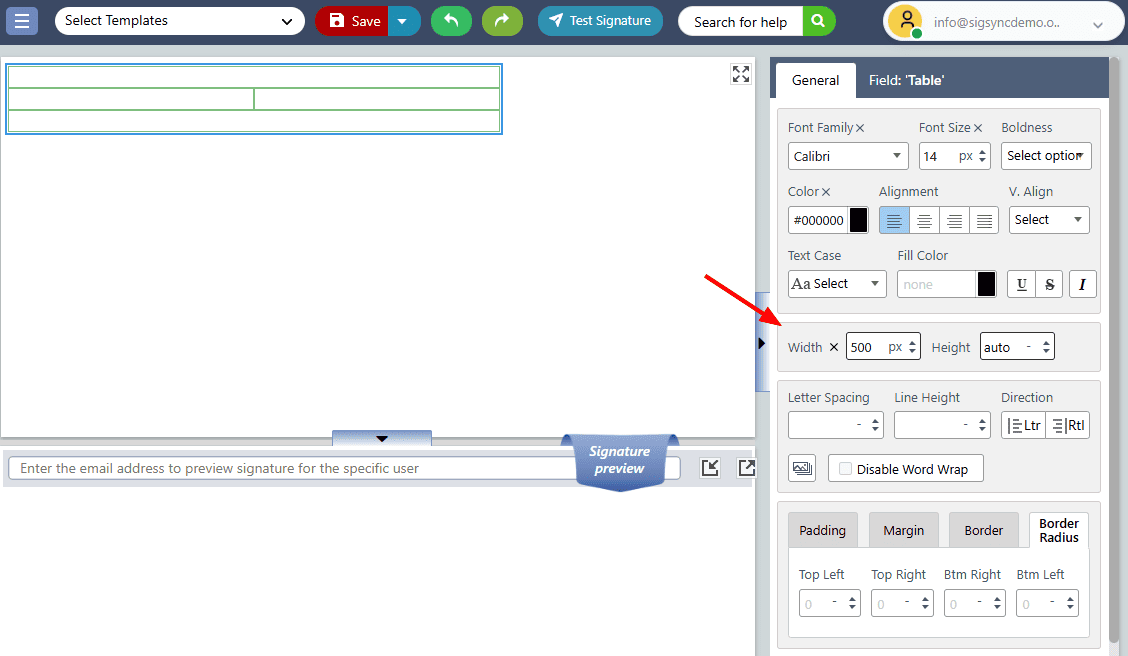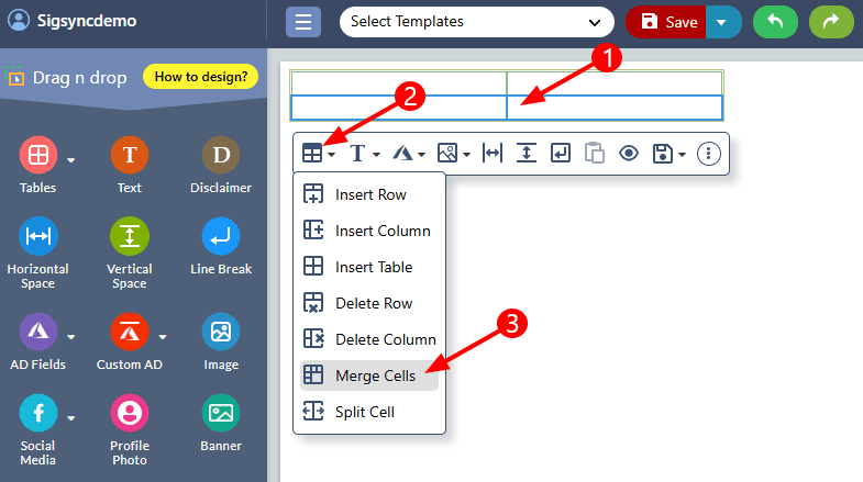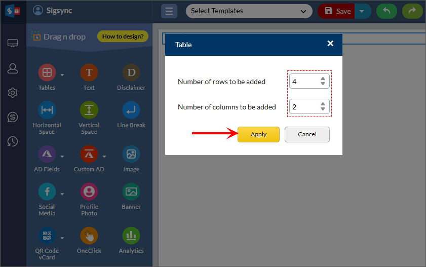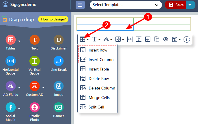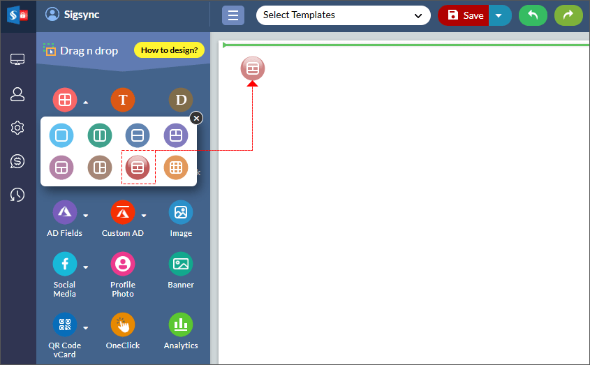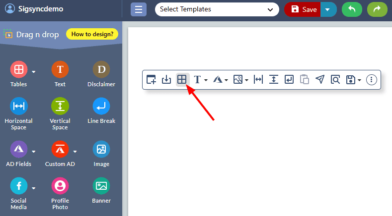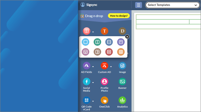 It is recommended to use tables to keep the signature layout consistent and to avoid signature elements fields shifting around in different mail clients and screen resolutions. Sigsync provides different table components as per the design requirement. To insert a table, just drag and drop a required shape of the table component into the design area from the left side of the editor.