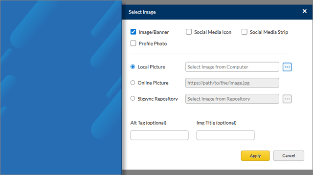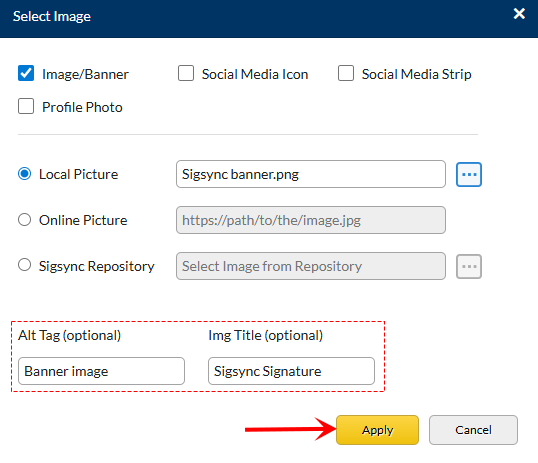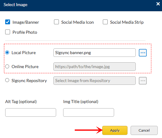 Enter the appropriate Alt Tag and Image Title and click the 'Apply' button