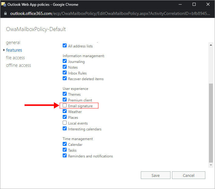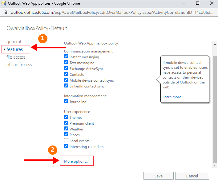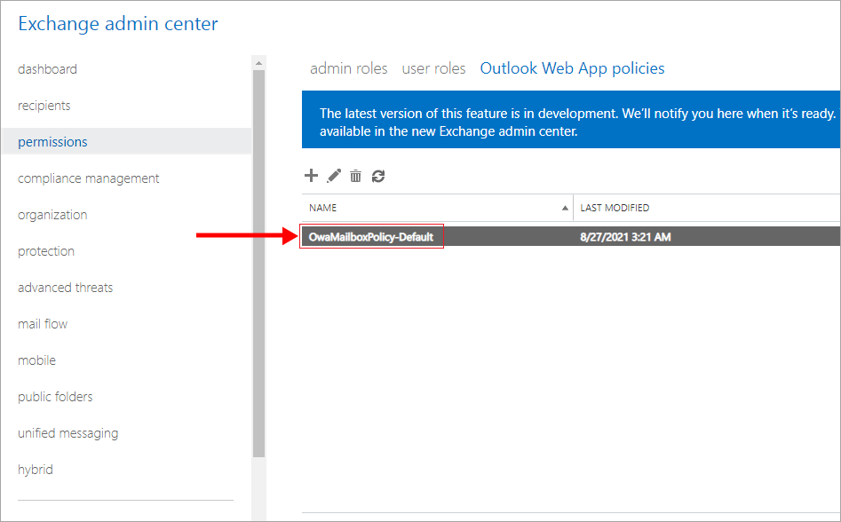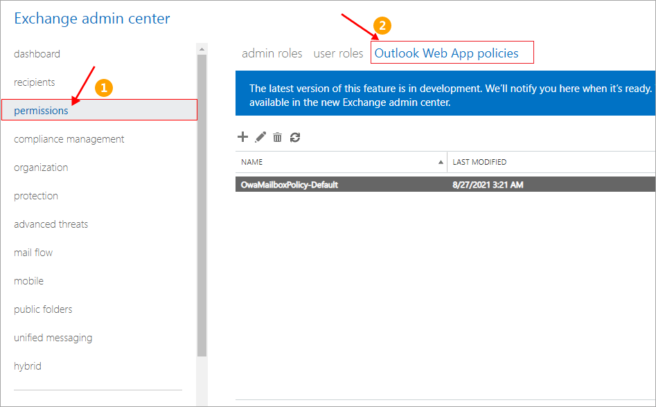 - Choose 'permissions' from the left panel and click the 'Outlook Web App policies' tab