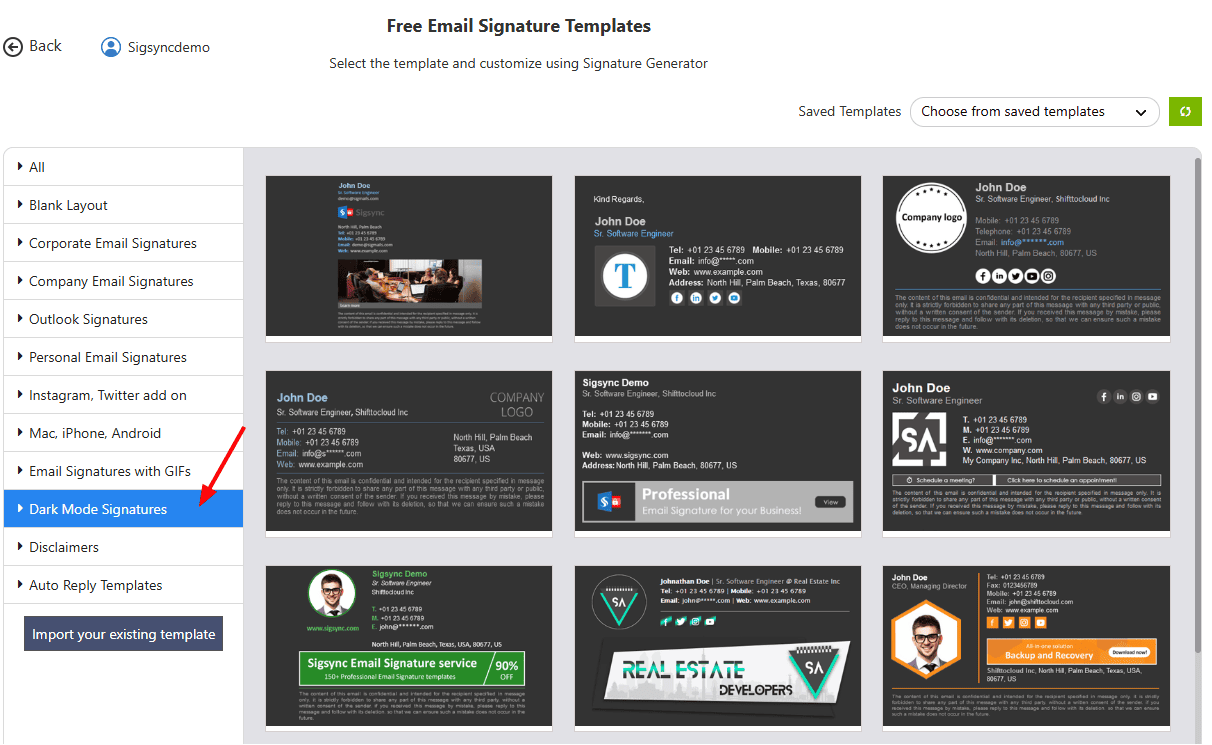 Choose the 'Dark Mode Signatures' from the category panel and pick any template suitable for you.