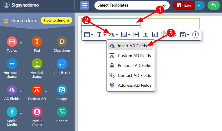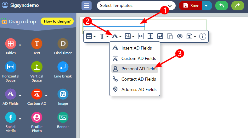For instance: Let's insert the 'Personal AD Fields' component. Select the table cell, click the 'Insert Active Directory' icon in the toolbar, and choose 'Personal AD Fields' from the dropdown menu.