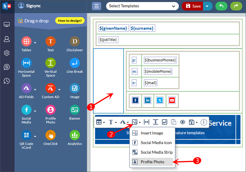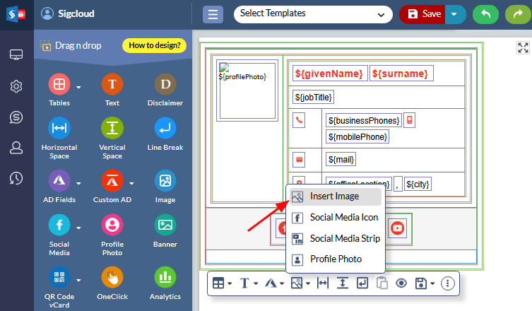 To insert a banner image or static profile photo into the signature template, select the table cell and choose 'Insert Image' from the dropdown menu
