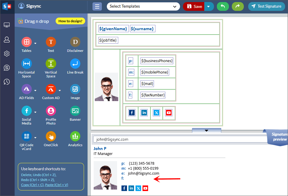 Sigsync supports Azure Active Directory fields (Example: ${displayName}, ${jobTitle}, ${companyName} ) to include in Signature. These fields automatically pull details from your active directory. With this, you can manage all the users signatures in a single template.