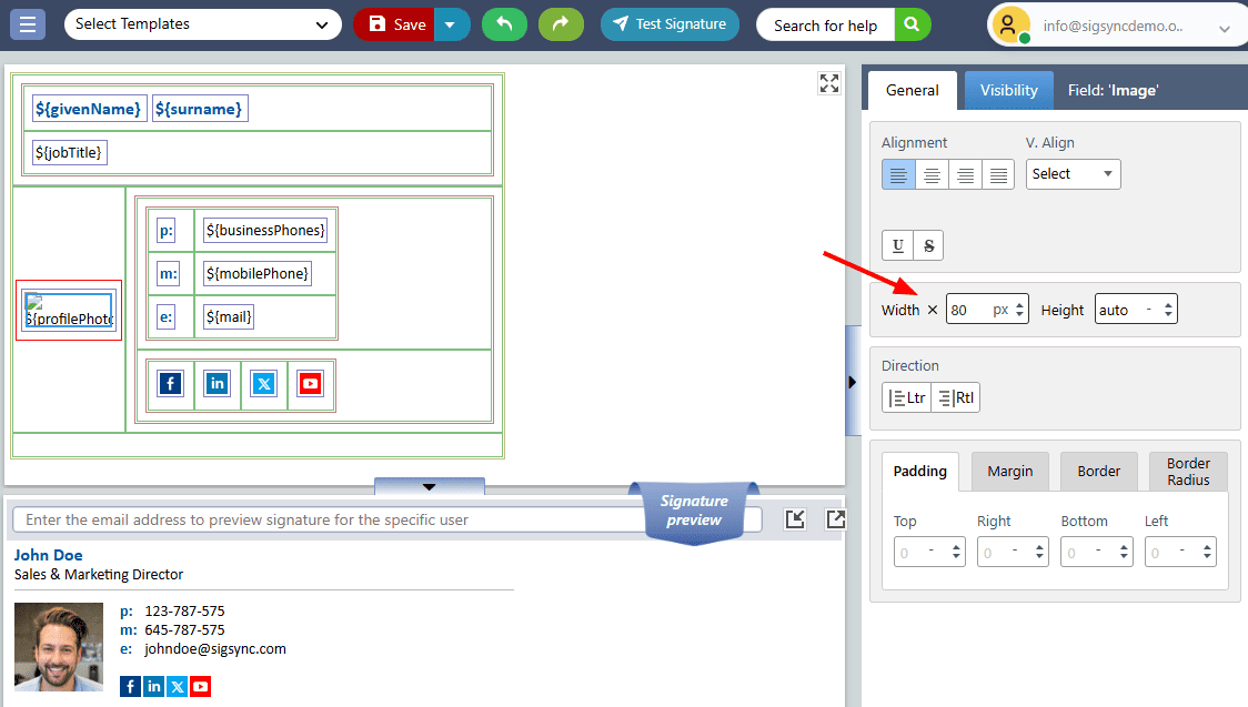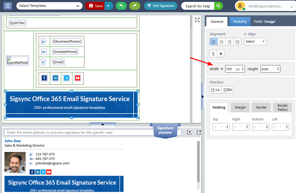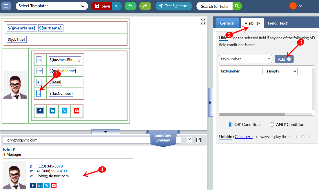 To prevent empty fields from appearing in your signature when the corresponding Active Directory value is not available, Sigsync provides the 'Visibility' property in the Signature Editor.
