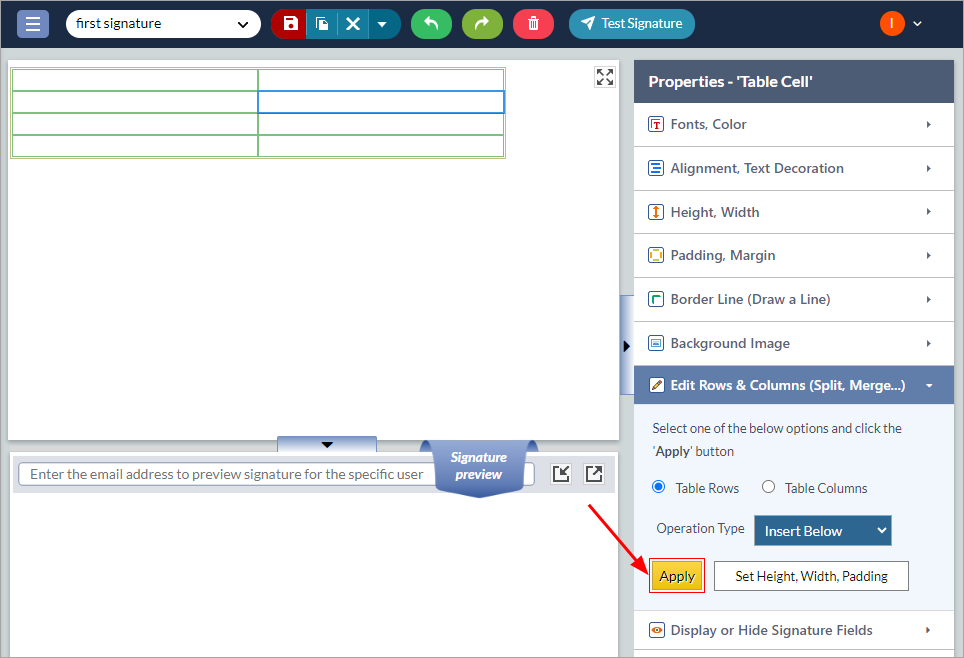 To insert a table with multiple rows and columns, click on the Signature Editor section and choose 'Insert Table' from the toolbar