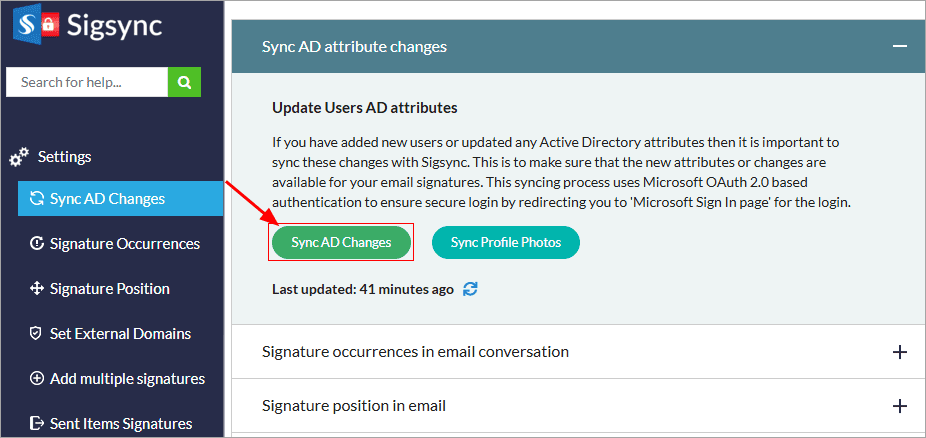 If you've added new users or changed any details in your Office 365 Active Directory, sync the changes with Sigsync. This ensures that the new updates for your email signatures are available. This syncing process ensures secure login by redirecting you to the 'Microsoft Sign in page'.