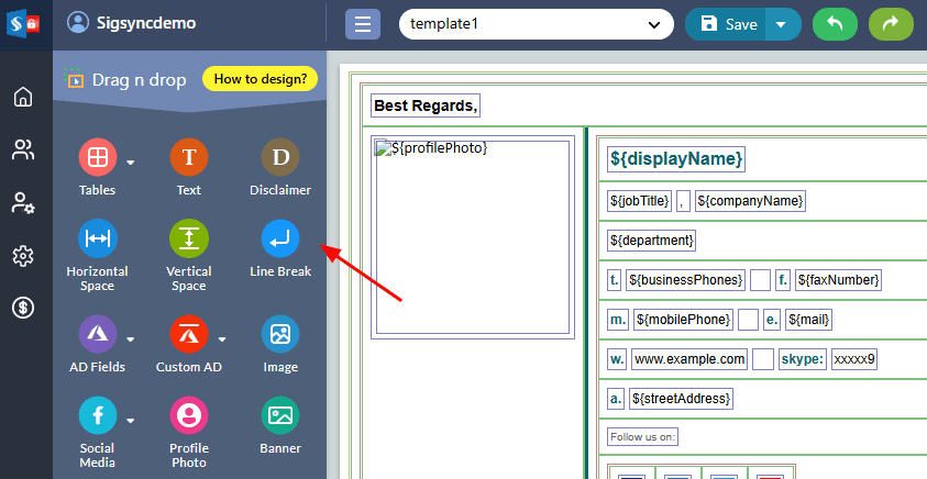 Sigsync Signature editor consists of various drag and drop components like Tables, Texts, Disclaimers, Dynamic fields (Personal, Address, Contacts, Active Directory fields, Custom AD, Message) Image, Banner, Icons, Profile Photo, Space, New Line, Social media Icon, Social Media Strip, QR code, vCard, Analytics Link, Oneclick etc. Using these signature components, you can design a tailormade email signature of your choice based on the requirements.