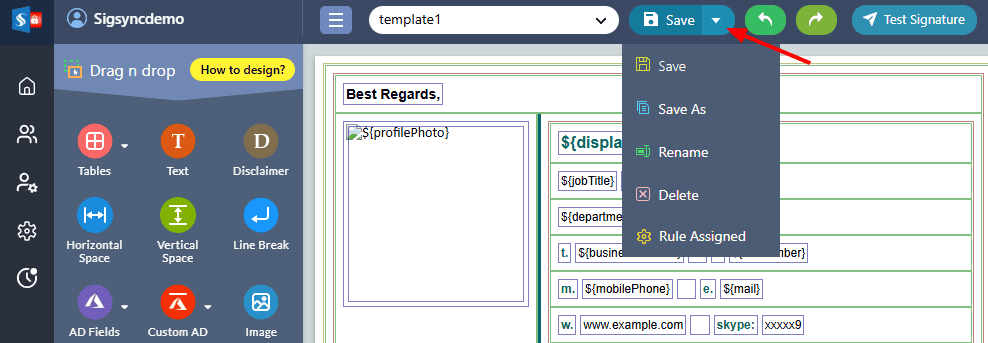 - Save As Template: This option allows you to create a duplicate of an existing email signature template. You can then modify the copied version to create a new template without affecting the original.